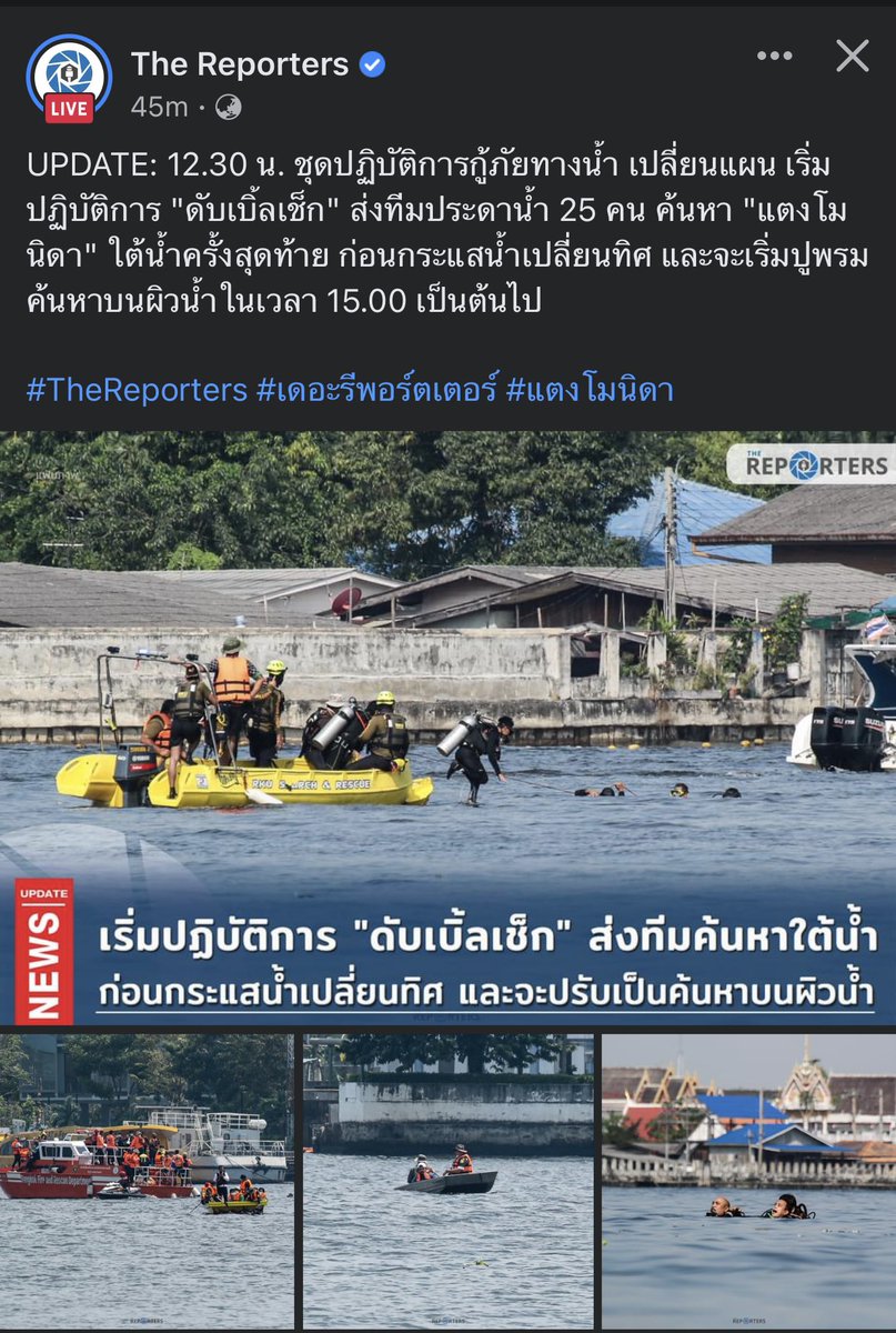 สำหรับความคืบหน้าล่าสุดหน่วยกู้ภัยมูลนิธิร่วมกตัญญู ประชุมปรับแผนการค้นหา เพราะช่วงเช้ามีอุปสรรคทางน้ำ เนื่องจากมีเรือสัญจรผ่านไปมามากขึ้น รวม . อัพเดทล่าสุด แตงโม นิดา ดาราสาวพลัดตกเรือสปีดโบ๊ตจมหายไปในแม่น้ำเจ้าพระยา ผ่านมาแล้วร่วม 32 ชั่วโมง ยังไม่พบร่าง. ขณะที่อินสตาแกรม โตโน่ ภาคิน หรือ โตโน่ เดอะสตาร์ อดีตแฟนหนุ่ม โพสต์ล่าสุดเจอฤทธิ์น้องหมาที่บ้านทำลายรถเข้าแล้ว แต่กลับกลายเป็นดราม่าขึ้นกลางไอ . จากกรณี แตงโม นิดา (ชื่อเดิม ภัทรธิดา) พัชรวีระพงษ์ อายุ 37 ปี ดาราสาวชื่อดัง เกิดพลัดตกสปีดโบ๊ต จมน้ำหายไม่รู้ชะตากรรม บริเวณใกล้เคียงกับสะพาน . เปิดไทม์ไลน์ แตงโม นิดา พลัดตกเรือจมน้ำเจ้าพระยา บริเวณสะพานพระราม 7 จนท.กู้ภัยค้นหา 12 ชม.